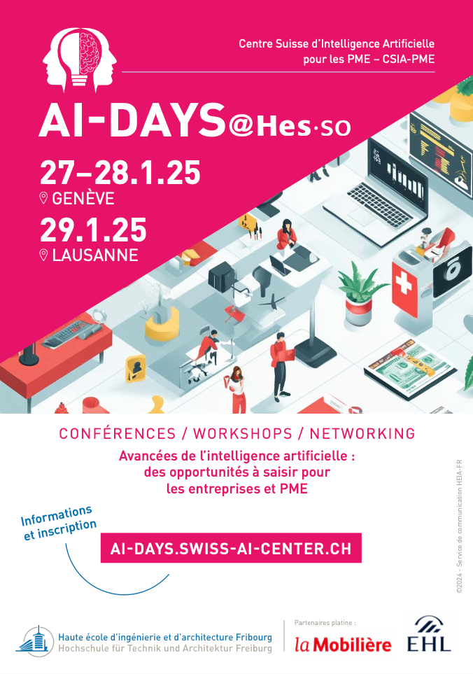 iCoSys is a proud member of the Swiss A Center for SMEs, organizing the yearly conference AI-Days where industries and organizations meet AI researchers to build next-gen applications. The event dates are 27-29 January 2025, two days in Geneva and one day in Lausanne. Visit https://ai-days.swiss-ai-center.ch/ for more information about the programme and subscription. Hurry up, the subscription is free and the places are limited.